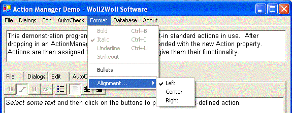 When an action's AutoCheck property set to true, all components associated with the action will have their Checked property stay in sync when one component's Checked property is updated. This is particularly useful and more common when you have a MenuItem from a menu, and a checkbox attached to the same action. The beauty is that you do not have to write any code to update their checked state. Also note that AutoCheck works for grouping buttons or MenuItems, allowing you a convenient way to have one component uncheck/unselect itself when another component having the same GroupName is checked or selected (such as a groupbox). See the screenshot at the top of this document and note the Alignment submenu is automatically controlled by the ActionManager to toggle all related menuitems. |