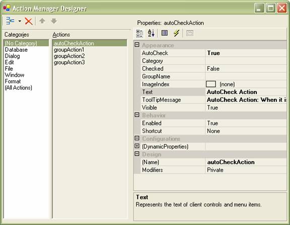When using the ActionManager’s pre-built actions, you only need to assign the Action property of your user-interface control to enable its functionality. If you are building your own actions, then define the properties and events with the Designer, and then later associate them with your user-interface control. The following are some of the ready actions that ship with the product.